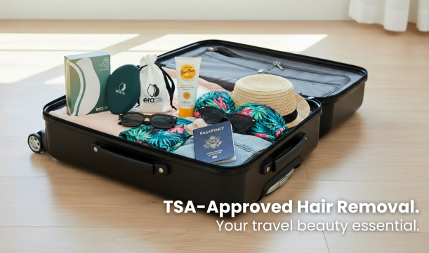 En parlant de voyage – si vous avez déjà eu la sécuritéconfisquer votre rasoir ou fait face aux tracas d'emballer des fournitures de rasage, vous allez adorer cet avantage. Erasilk ne contientaucune lame, aucun liquide et aucun composant électronique, ce qui le rendtotalement approuvé par la TSA.